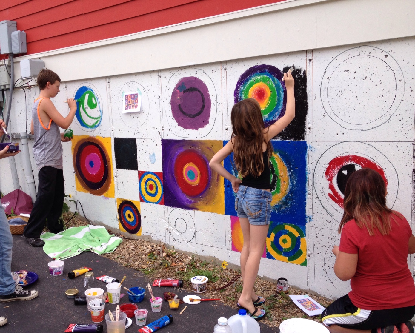 Because I recently facilitated the painting of a mural on the side of my garage, I have circles on my mind. For this mural, based on a Kandinsky painting, over 20 members of my cohousing community (plus a few neighbors) pitched in to paint a circle or two. Aged 3 to 60, the painters added their unique perspectives to the mural.